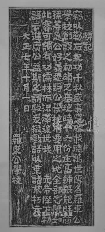 碑碣原文:竊以勒石紀功,千秋盛事;豊碑載德,萬世傳名。 羅東公學校創設之初頗乏基址,時十六份庄富紳張能旺裔孫等,急心好義,悉將公學校所要用之地全部寄附,如此實可謂有功儒林而流釋後世。 我先帝陛下敕語云:「進廣公益,斯之謂歟。」爰掇數語,以垂諸不朽云。 大正七年十月一日,羅東公學校。