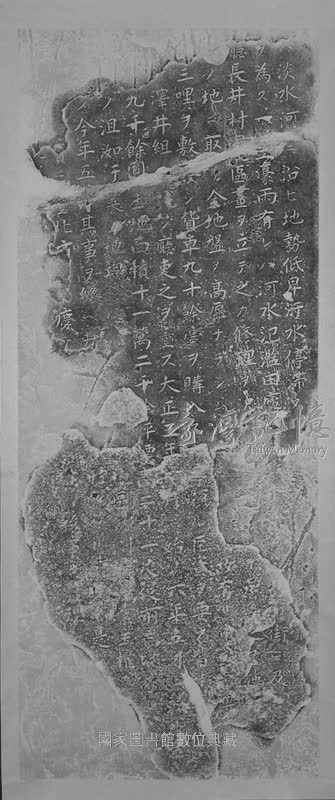 碑碣原文:ハ淡水河ニ沿ヒ地勢低卑汙水停滯スル…………………ヲ為ス一□□豪雨有レハ河水氾濫田盧…………街ニ及…………廳長井村君□區畫ヲ立テ之カ修理ヲ沢…………施………ノ地ニ取□金地盤ヲ高厚ナラシムル……………故有…………………三哩ヲ敷□シ貨車九十餘臺ヲ購入ス□□頗ル巨資ヲ要□皆街……………澤井組……シ廳吏之ヲ重ス大正三年□月ニ始ノ六年五月ニ竣□金……九千餘圓土地面積十一萬二千餘坪標高二十一尺從前□□スレ……………ノ沮洳汙□ノ地理然壙………………地區………業主權ヲ……………ノ今年五月□其事ヲ………………是……………………。