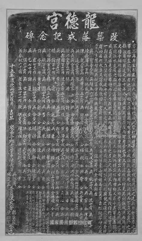 碑碣原文:嘗思萬寿宮則置於漢,九成宮則修於,此皆禮神避暑之盛典也。如我龍德宮之建,無非仿漢唐之遺事,邀神聖之錫福者也。溯經始之年,匾額所有,書:康熙庚子歲;雖設立最先,似泛泛而不真究。重修之数,樑籤有所載:道光三十年、光緒庚寅歲,實在在而可考。今也年久月深,榱題將見其剝蝕,風□雨滴牖右又待乎綢繆。蓋協力樂輸腰纏誰有吝,解而仔肩任重領袖孰肯出?為幸有二、三鄉耆,思眾志成城之易,不同孤木支廈之難,關心善舉豈置罔聞?有志玉成,遂為發起外捐出稼,內劝鄉人,累千累百,遂集腋以成裘。是經是營,亦舉行而量力,故於大正九年庚申五月之吉,二尺添闊三尺,增高用改;作於旧貫,煥然一新;巍然在望,則增建乎前亭。藉人眾之共攻,及小春而告成。從此規模大備,膽廟貌之莊嚴,崇敞奇覌,慶神居於永奠。又窃感而歌曰:「宮殿盤鬱,人和地利;西海波恬,東山明媚。高亭翼然,古松挺翠;神乃英靈,人多慧智。既庶既富,俾昌俾熾。」爰述数言,刻石以記。 謹將寄附金芳名列左: 吳寶三百五十三丹,陳長澤三百丹,陳乾三百二十丹,洪追三百十五丹。吳長庚二百○四丹,陳淵堂百六十丹,吳郭周百十七丹,吳禮百十二丹,楊詞百十丹,陳順堂百○六丹,吳換百○四丹,許永百丹。吳宏七十一丹,吳乞七十丹,郭備六十五丹,蕭春秋六十三丹,吳超五六十一丹,郭媽成六十丹,吳辛已五十九丹,陳亨五十六丹、吳振家仝、楊源仝,陳其奢五十四丹、李雲行五十三丹、陳霞仝,楊成五十丹。吳團四十九丹、黃奇才仝,吳詮四十四丹、謝夏仝,吳士四十二丹,蕭自生四十一丹,吳東碧四十丹。刘分三十五丹,吳諒三十四丹、吳清月仝,洪命三十三丹,許海三十二丹、顏煦仝、吳連興仝,任選三十丹、吳奈仝、吳吉仝、郭準仝。吳合二十八丹、許安仝,吳秋二十七丹,歐棋二十六丹,吳為二十五丹、楊光庇仝、刘萬成仝,許兒二十四丹、吳金鳳仝、李義仝,黃降二十三丹,郭清心二十二丹、吳臣仝、莊標仝、吳朱仝、陳順籐仝、楊得仝、陳章二十一丹,江助二十丹、陳順旺仝,吳頂成二十丹、張仁仝、楊秋仝。吳安東十九丹,蕭府十八丹,黃額十七丹、吳東森仝,許被十六丹、楊接仝,陳華十五丹、吳放仝、陳長仝、郭獅仝、楊雲陵仝、吳文董仝,陳順親十四丹、吳墘十四丹、吳劳仝、洪奢仝。金永順、船旧股、洪修永、長順號、吳長庚、陳梁、郭媽成、陳柳、郭回、楊再,以上計百丹。吳敬十三丹、吳寮仝、吳意仝、陳皆室仝、許媽帶仝、吳溫仝、郭榮,吳波十二丹、吳雲仝、吳安業仝,陳皆□十一丹、吳籐仝、蕭日仝、吳心仝,金永順十丹、金順勝仝、蕭發喜仝,吳丁十丹、陳吳氏匹仝、吳東順仝、蕭□仝、周棟仝、吳江度仝、吳馬仝、吳耀仝、李泉仝。吳廷集石工百二十丹。吳順、蕭媽恩、許水、許琴、吳朱倫、任珍、郭文水、吳振祥、吳寬敏、蔡添丁、林良□、吳順員、吳荐、吳祥、吳養兒、吳照、吳□、郭氏桃、楊啟宗、林國、吳求、吳崇山、吳坪、蕭春服、吳炳裕、阮氏当、許氏帶、吳飛來、吳朱平、吳氏況、以上未滿十丹也。 大正十五年歲次丙寅葭月吉旦,眾弟子鄉耆董事陳長澤、吳郭周、楊達三,委員陳其奢、楊雲陵、陳淵堂仝立。