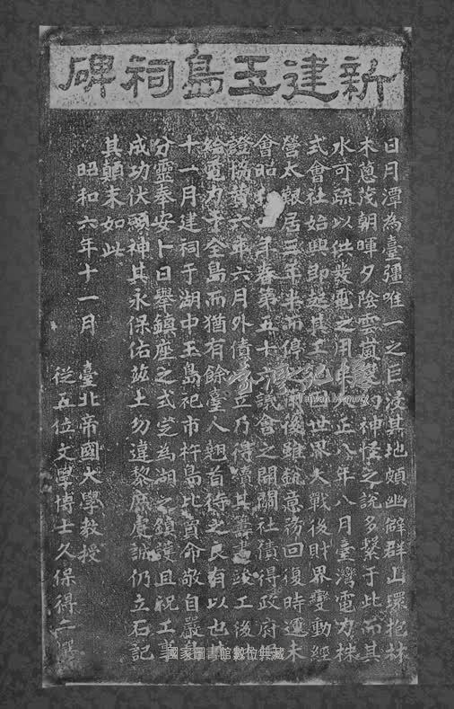 碑碣原文:日月潭為臺疆唯一之巨浸,其地頗幽僻,群山環抱、林木蔥茂,朝暉夕陰、雲嵐變幻;神怪之說,多擊于此,而其水可疏以供發電之用矣。 大正八年八月,臺灣電力株式會社始興,即起其工。適因世界大戰後,財界變動經營太艱,居三年半而停之。爾後雖銳意務回復,時運未會,昭和四年春,第五十六議會之開關社債得政府保證協贊,六年六月外債成立,乃得續其籌畫;竣工後供給電力于全島而猶有餘。臺人翹首待之,良有以也。 其十一月建祠于湖中玉島,祀「市杵島比賣命」,敬自嚴島分靈奉安,卜日舉鎮座之式,定為湖之鎮護。且祝工事成功,伏願神其永保佑茲土,勿違黎庶虔誠。仍立石,記其顛末如此。 昭和六年十一月,臺北帝國大學教授、從五位文學博士久保得二撰。 台北原石店刻。