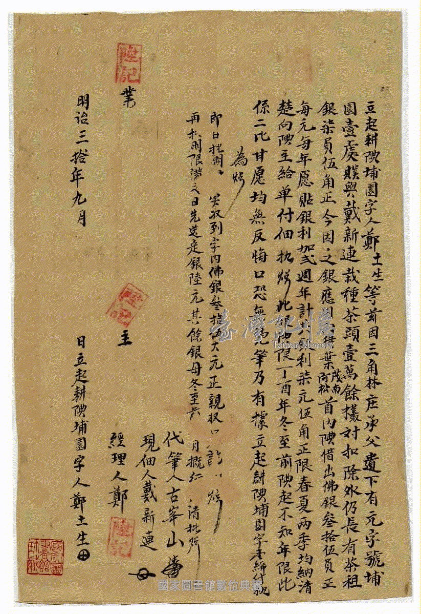 立契人、關係人、承受人:。 鄭土生、代筆人古?山,現佃人戴新連,經理人鄭陞記、葉茂南、葉阿松。