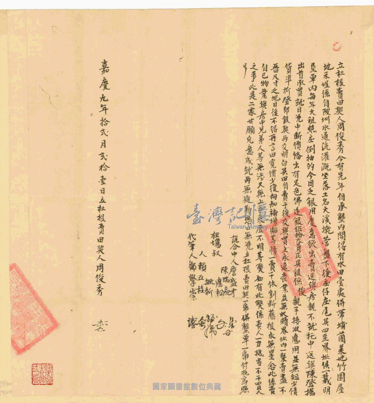 立契人、承受人、關係人:。 周俊秀、陳登楊、說合中人詹盛才、陳瑞亮,在場叔周應松、周毓新、賴五桂,代筆人鄒學崇。