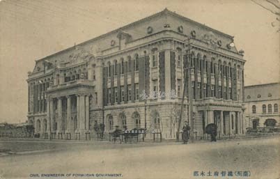 (臺灣) 總督府土木部 森山松之助在1907年設計,是總督府建築群之一,位在總督府正後方,1919年臺灣電力株式會社成立後,改為社廈,1945年5月30日晨5時遭受美軍B29炸毀。這張應拍攝於1908年剛完工啟用時,其一樓的線條紋飾與總督官邸的線條是一樣的。