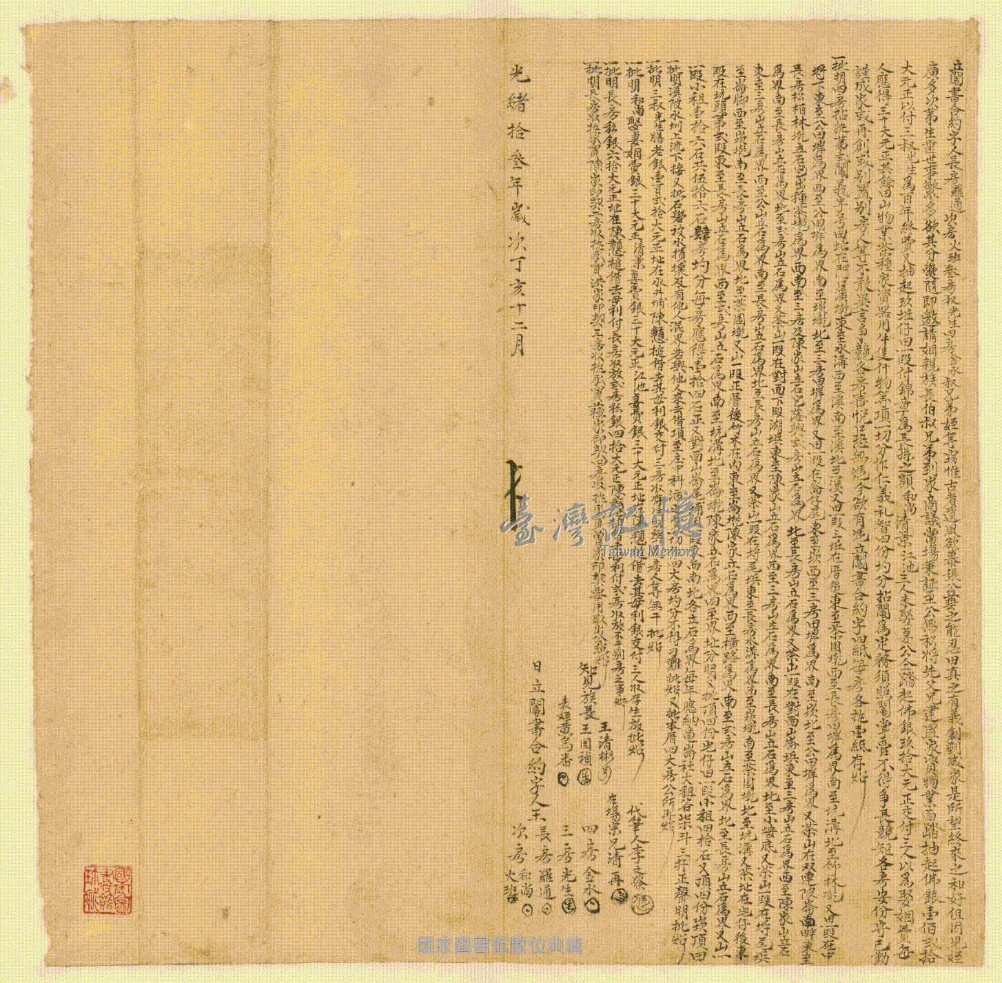 立契人、承受人、關係人:。 王羅通、王火班、王光生、王金水、王和尚、知見族長王清彬、王國禎、表姪黃烏番,代筆人李文癸。王光生、王錦章、王清景、王江池。