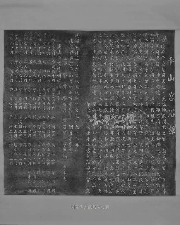 平山宮創建於清同治九年(西元一八七○年),主祀媽祖,日據大正七年(西元一九一八年)重修,始尊稱「平山宮」;民國六十七年(西元一九七八年)重建為北朝式神宮,至民國七十三年(西元一九八四年)竣工。落成之日,勒碑記其沿革,並重刻該宮日據重修委員與捐題情形,形成新舊並陳的現象。因有日據資料,故採拓之。