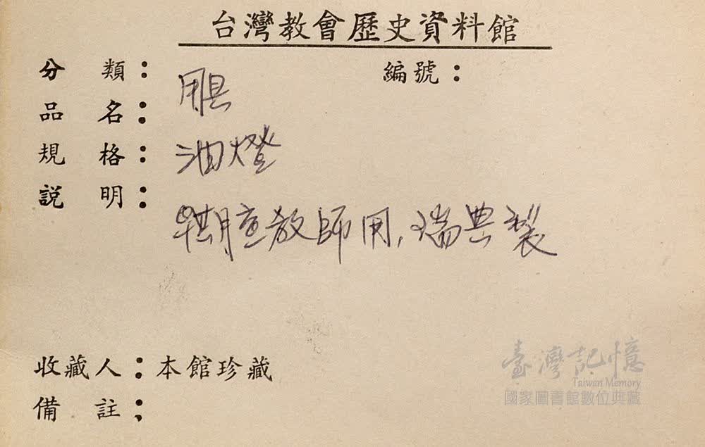 1965年為慶祝長老教會在臺傳教百週年紀念成立「巴克禮及教會文物史料館」於臺南神學院。這項物品大約在同時進入史料館成為館藏品的一部分。