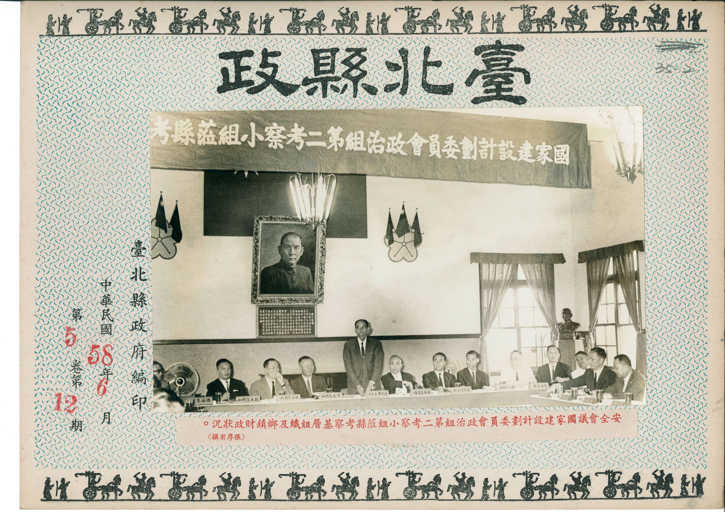 照片為1969(民國58)年6月,安全會議國家建設計劃委員會政治組第二考察小組蒞縣考察基層組織及鄉鎮財政狀況之情形。照片中委員一字排開坐在會議桌前,牆上掛著國父遺像、遺囑,及插著國旗的梅花標誌。