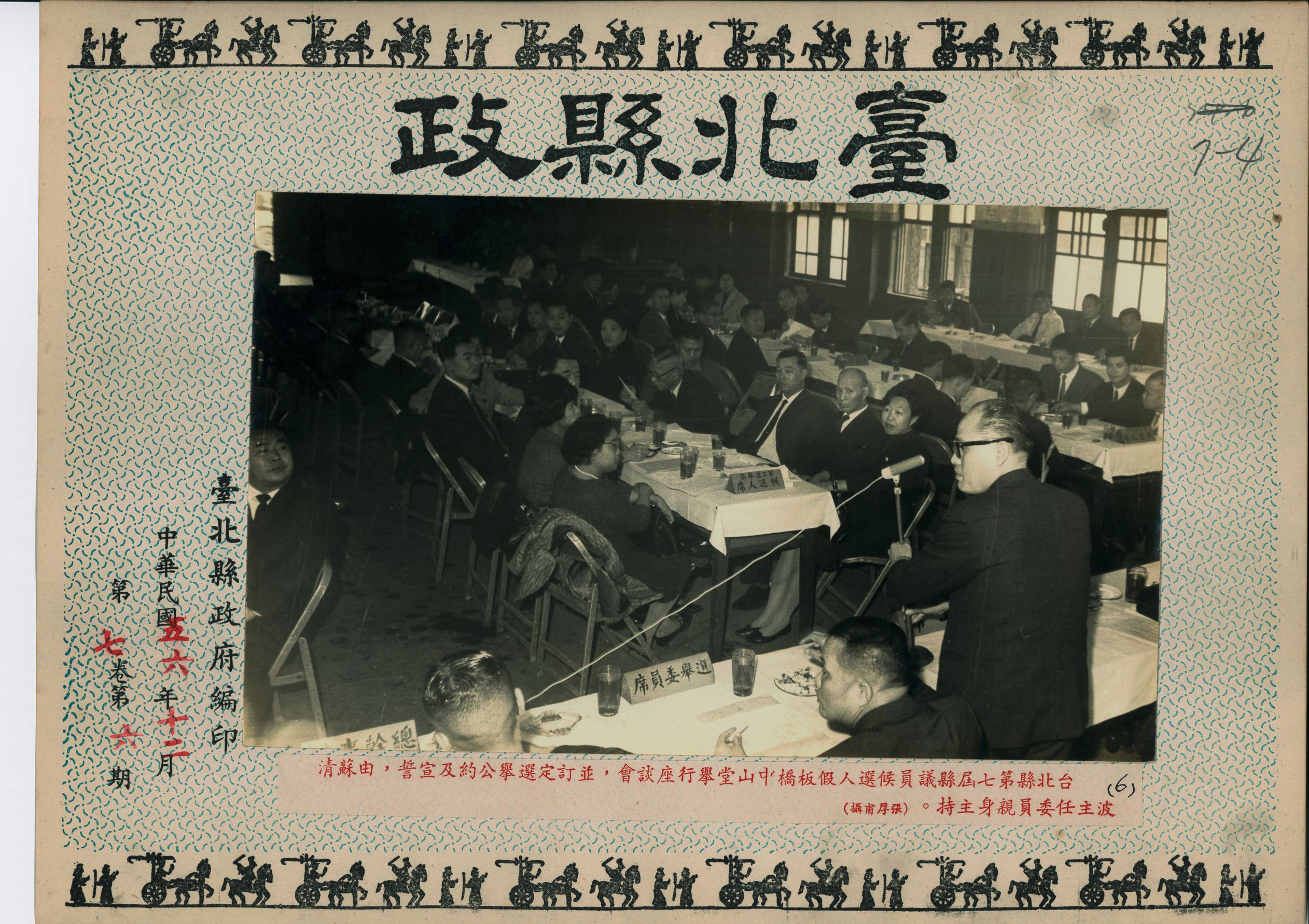 1967(民國56)年12月,臺北縣第七屆縣議員候選人假板橋中山堂舉行座談會,並訂定選舉公約及宣誓,由蘇清波主任委員親自主持。整個會場分為選舉委員席及候選人席,而後者再依選區安排候選人入席。 蘇縣長站在選舉委員席中央,手握麥克風準備主持。