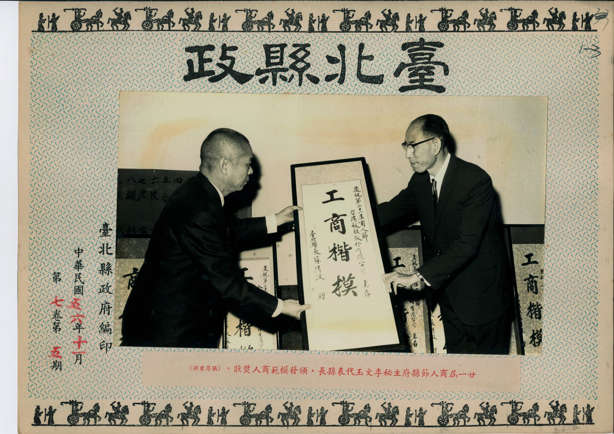 每年11月1日為商人節。1967(民國56)年11月第21屆商人節,臺北縣政府府主任秘書李文玉代表蘇清波縣長,頒發模範商人獎狀。照片中李主任秘書雙手遞出有著「工商楷模」字樣錶框的大型獎狀給受獎者,受獎公司代表恭敬的以雙手接住。政府遷臺後,各商業團體透過各類活動慶祝商人節,象徵商人團結合作,同時建立形象,對於國家長遠發展扮演重要的角色。
