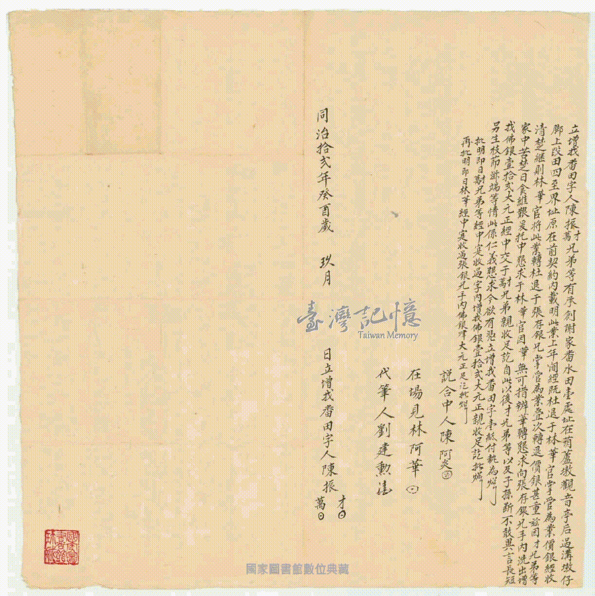 立契人、關係人、承受人:。 陳振才、陳振萬、說合中人陳阿炎,在場見林阿華,代筆人劉建勳、張存銀。