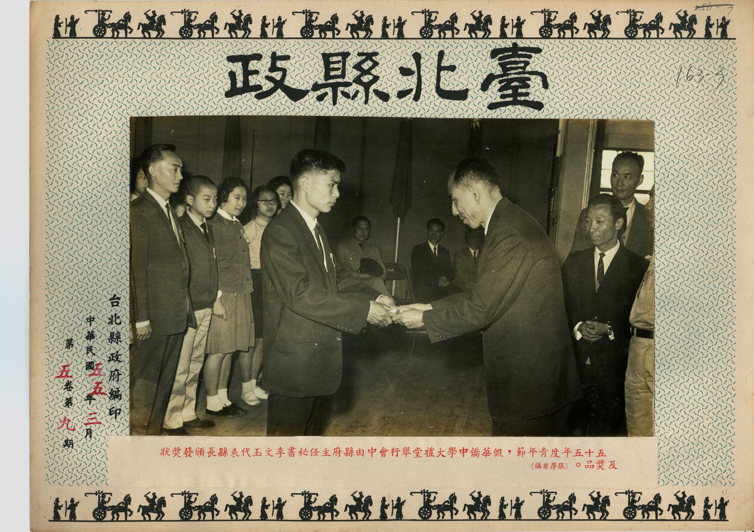 1966(民國55)年3月青年節慶祝大會頒獎典禮假華僑中學大禮堂舉辦。大會邀集各地遴選出來的優秀青年代表與會,並由臺北縣政府主任秘書李文玉代表縣長頒發獎狀及獎品給獲獎的優秀青年,照片左方受獎的同學包括高中及大專院校學生,他們穿著該校制服領獎,後方席間,還有黨政軍高層觀禮。