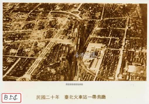 照片是在臺北火車站附近鳥瞰拍攝的,畫面中央的三線道路為今日之忠孝西路,道路右側為縱貫鐵路,縱貫鐵路在經過北門後向左彎曲,沿著今中華路向萬華一帶延伸而去。