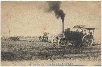圖同藏品編號002417233明信片「鹽水港製糖會社農場使用蒸汽犁田機耕作 臺灣」。