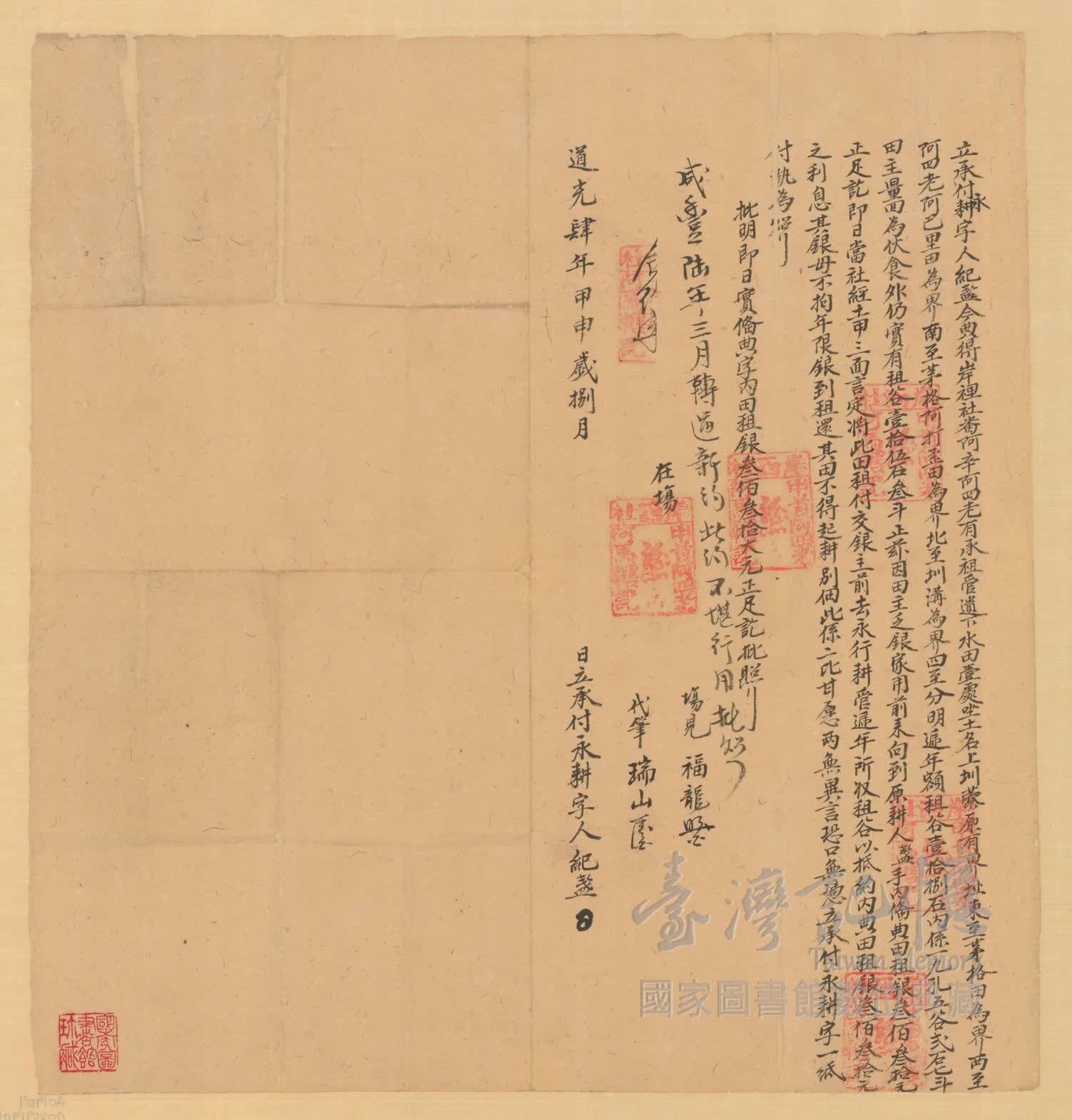 立契人、關係人、承受人:。 紀盞、在場阿四老阿馬轄,場見福龍,代筆瑞山、阿辛阿四老。