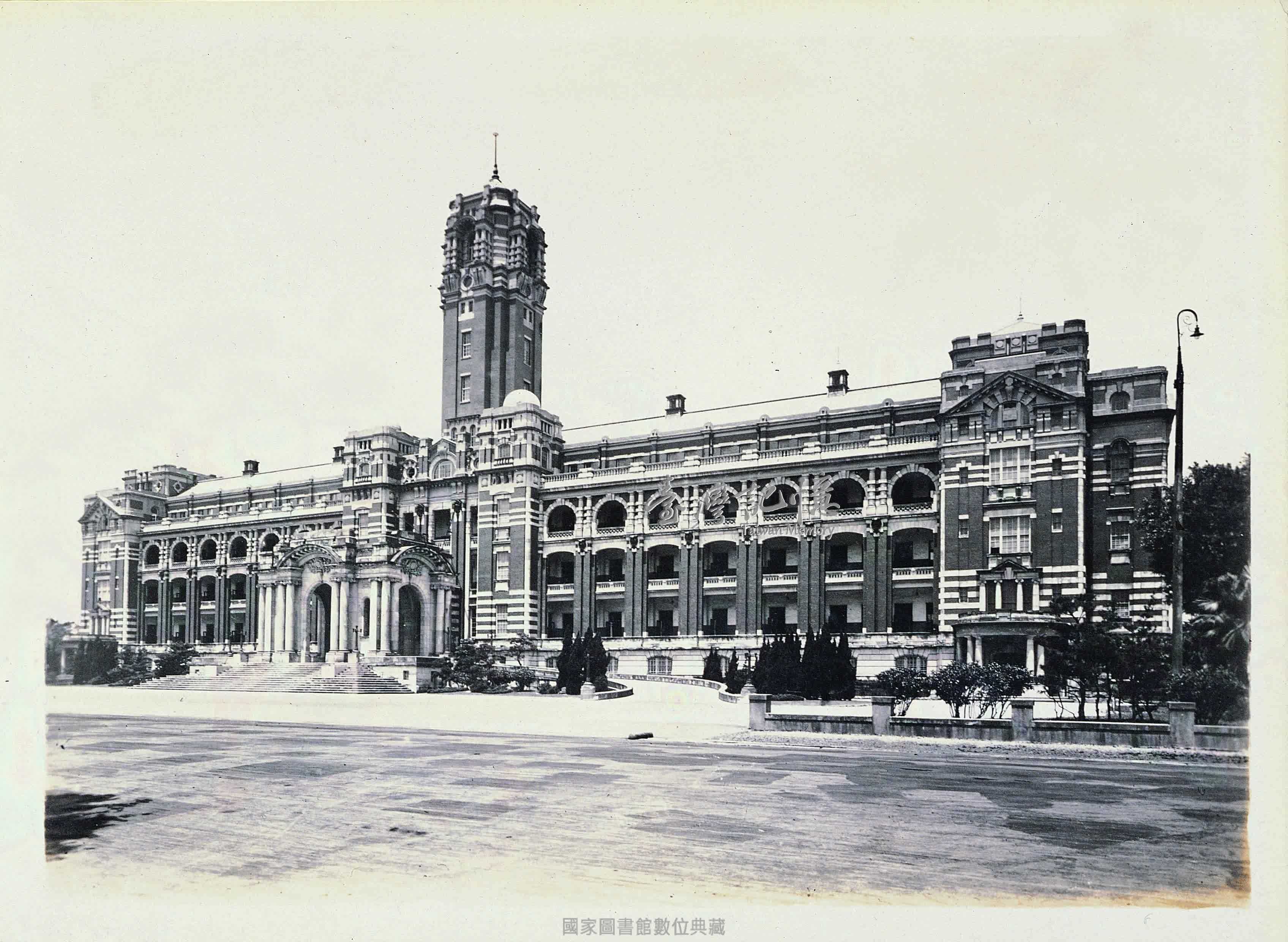 距基隆約一個小時的火車行程,接近臺北時,即可看見聳立窗外的這座高塔吧!它即是統治本島的中樞總督府的廳舍。其規模宏偉且美侖美奐足以讓行人駐足讚嘆。由地上至五層樓的高塔,高一百呎,於明治45年(1912)動工,投下了兩百多萬圓的鉅資,完成於大正8年(1919)3月,是本島最大的建築物。在其正前方有以莊嚴華麗聞名的總督官邸。