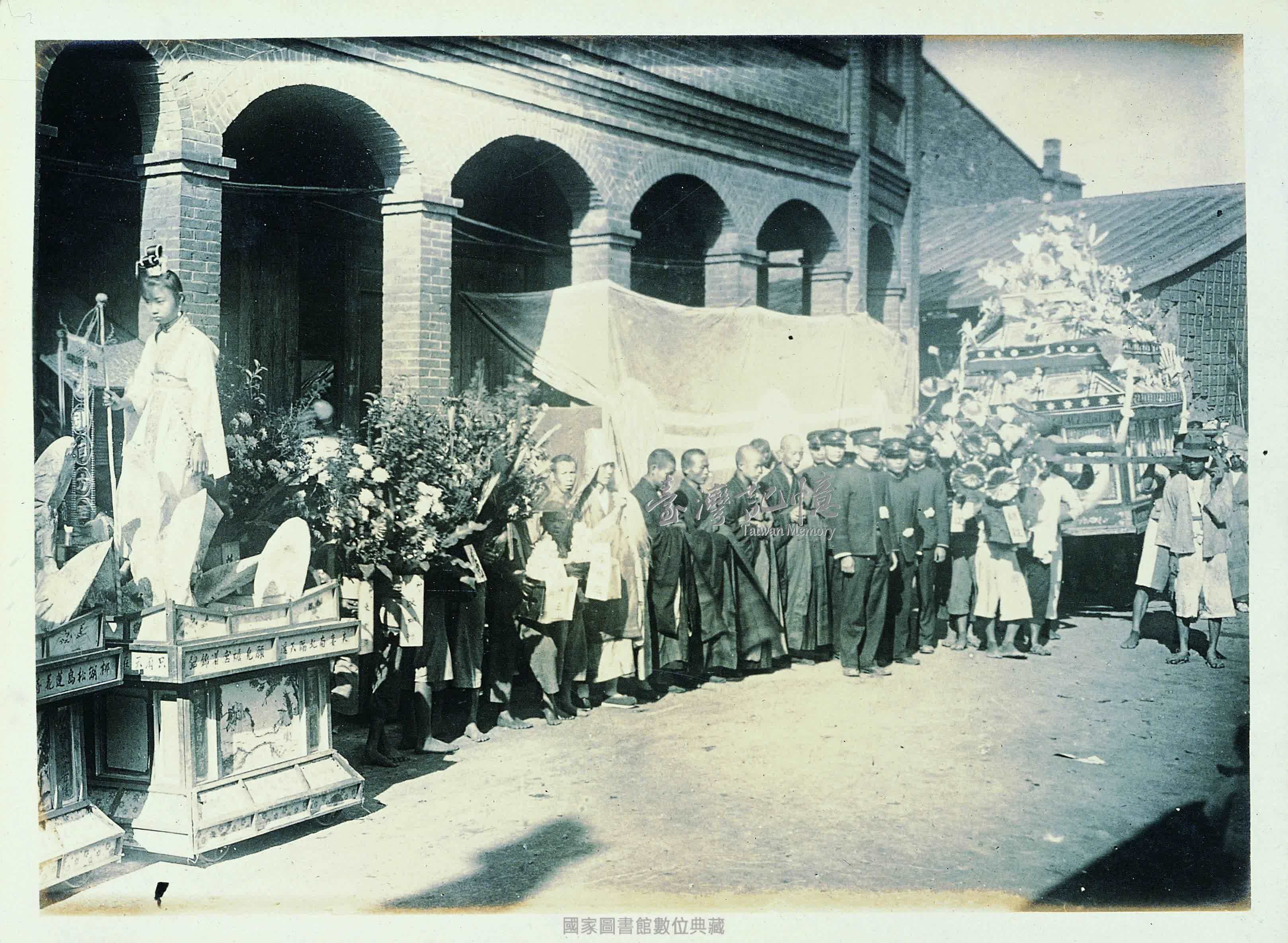 葬禮是任何國家都有的傳統習俗。照片是本島人中產以上的喪禮行列的局部。依據貧富,而有不同的裝飾,送葬的人披麻衣、麻冠依序相隨,鐘、笛、鼓齊鳴,乍見如祭典廟會般,但音樂是哀傷的。據說有資本家不惜鉅資,製作各種陣飾,花巨額金錢以慰亡靈。