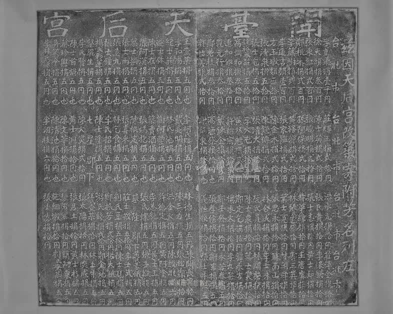 碑碣原文:茲因天后宮改築,寄附芳名列左: 台北市:李鳶飛捐壹千円,徐大頭捐參百円、張東紅捐弍百円、鄭根木捐弍百円、李藤樹捐弍百円。李通吉捐壹百円,方玉墩捐五拾円、張清泉捐五拾円、張士乞捐五拾円、捷裕參莊捐五拾円,高調和捐參拾円、連加錐捐參拾円、乾元行捐參拾円、鄭老杜捐參拾円,郭怡美捐弍拾円。 台北市:莊輝玉捐弍拾円、陳士英捐弍拾円、張聰明捐弍拾円、孫阿保捐弍拾円、黃裕源捐弍拾円、張家鑑捐弍拾円、陳金木捐弍拾円、陳鑅傳捐弍拾円。張清大捐拾五円、李火屯捐拾五円,黃双魁捐弍拾円,許朝宗捐拾弍円、葉鍊金捐拾弍円,高源發捐拾円也、謝炳東捐拾円也。 台北市:洪水元捐拾円、張氏貴捐拾円、張士志捐拾円、林華緯捐拾円、林張氏雹捐拾円、葉士寬捐拾円、張思永捐拾円、林合成捐拾円、阮氏員捐拾円、陳士泉捐拾円、鄭定乞捐拾円、楊木火捐拾円、鄭壬癸捐拾円、張孝侯捐拾円、義恒發捐拾円。 台北市:莊輝金捐拾円、李保發捐拾円、黃士炉捐拾円、王唐虞捐拾円、郭三英捐拾円、林朝舜捐拾円、蘇南山捐拾円、李士味捐拾円、林問榮捐拾円、葉士笑捐拾円、鐘永吉捐拾円、李九靳捐拾円。永芳春捐五円、謝宗揚捐五円、張士本捐五円、王查某捐五円也、李和尚捐五円也、紀士英捐五円也、連士體捐五円也、陳士在円也、張阿漢捐五円也、蔡士換捐五円也、張士雨捐五円也、張怣九捐五円也、張士鐘捐五円也、楊氏彩蓮捐五円也、蔡錕生捐五円也、李氏賢捐五円也、陳士首捐五円也、蔡珍興捐五円也、吳篤今捐五円也、李林氏謙捐五円也、李柯氏珠捐五円也、戴炎明捐五円也、林氏池捐五円也、謝阿豐捐五円也、蔡賣酒捐五円也、張媽抱捐五円也、陳根定捐五円也、張喜來捐五円也、林乞食捐五円也、李氏招捐五円也、陳士塗捐五円也。 七星郡下: 陳火炎捐弍拾円,黃士洲捐拾円也、陳文華捐拾円也、陳清池捐拾円也,李朝枝捐六円也。林德生捐五円、陳三力捐五円、洪金火捐五円、許德定捐五円、李怣匏捐五円、張氏螺捐五円。 基隆郡下:莊士敬捐五拾円、劉士豆捐五拾円,鄭振芳捐弍拾円、游氏錢捐弍拾円,汪氏查某捐拾円、張太陽捐拾円、張君土捐拾円、張阿華捐拾円、施烟墩捐拾円、張士怣捐拾円、陳開長捐拾円、張松霖捐拾円。陳頭北捐六円,黃阿塗捐五円、黃士王捐五円、張子敬捐五円、黃氏素娥捐五円、李士武捐五円、陳士□捐五円、楊大□捐五円、鄭金池捐五円、林土牛捐五円、林炎成捐五円、黃士杉捐五円、簡阿泉捐五円、劉氏查某捐五円。