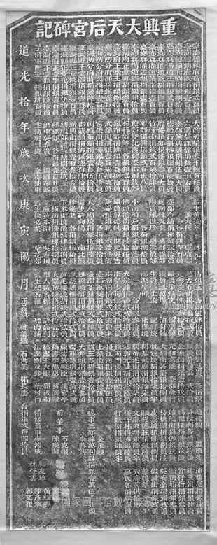 本件碑記為清道光十年(西元一八三○年)台郡大天后宮重修捐題記錄,文中多當時台灣府文武官員、士紳、郊商、店舖、街坊等名稱,可見其時社會與商業活動的狀況。文中「台澎總鎮音」,名登額;「總鎮觀」,名喜;「總鎮劉」,名廷斌;「台澎兵備道汪」,名楠;「兵備道蓋」,名方泌;「兵備道葉」,名世倬;「兵備道胡」,名承珙;「兵備道劉」,名重麟;「台灣府正堂鄭」,名佐廷;「正堂王」,名衍慶;「台海防分府邵」,名葆醇;「分府吳」,名性誠;「分府蔣」,名鏞;「台灣縣正堂溫」,名溶;「正堂姚」,名瑩;「正堂李」,名慎彝;「正堂顧」,名鄰;「子爵軍門王」,名得祿。碑文曾收錄於「南碑集成」。