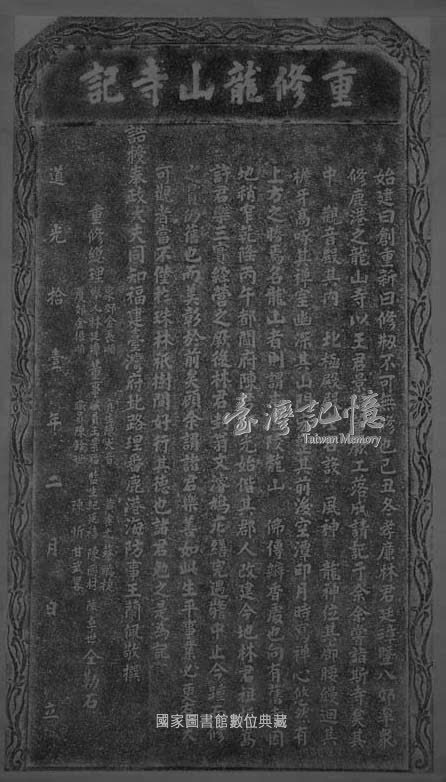 碑碣原文:始建曰創、重新曰修,□不可無修也。己丑冬,孝廉林君廷璋暨八郊率眾修鹿港之龍山寺,以王君景福董厥工。落成,請記于余。 余嘗詣斯寺矣。其中觀音殿,其內北極殿,殿左右設風神、龍神位。其廊腰縵迴、其檐牙高啄,其禪室幽深、其山門宏整。其前後空潭印月,時寫禪心,悠然有上方之勝焉。名龍山者,則謂本溫陵龍山佛傳瓣香處也。向有舊寺,因地稍窄,乾隆丙午,都閫府陳君邦光始偕其郡人改建今地;林君祖振嵩、許君樂三實經營之。厥後林君封翁文濬鳩庀繕完,遇警中止。今踵而修之。貫仍舊也,而美彰於前矣。 顧余謂諸君樂善如此,生平事業必更有大可觀者;當不僅於珠林祇樹間好行其德也。諸君勉之!是為記。 誥授奉政大夫同知福建臺灣府北路理番鹿港海防事王蘭佩敬撰。 重修總理舉人林廷璋、泉郊金長順、廈郊金振順,董事職員王景福、貢生陳大音、職員陳銓世,監生紀廷禧、黃垂光、陳忻、陳國材、蔡鵬捷、甘武略、陳卓世仝勒石。 道光拾壹年二月 日立。