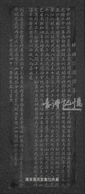 本件碑記係民國四十一年(西元一九五二年)林氏宗廟勒立,詳述創建沿革、新建始末與格局,以示後人而垂永遠。