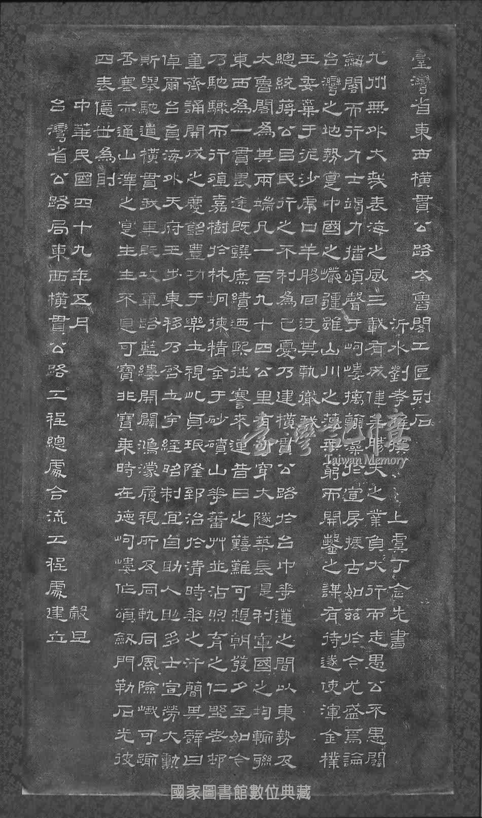 臺灣東西橫貫公路自民國四十五年七月興工,四十九年五月竣工,並正式通車。功成之日,勒碑紀念,並頌德行;文末詩頌,典雅傳情。