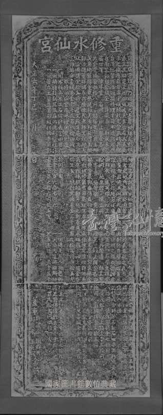 本件碑記係日據大正六年(西元一九一七年)水仙宮重修紀事,以及捐款者姓氏、商號與金額,文末並記重修經費開支情形,以徵信與紀念。唯文中稱該廟建於清康熙癸未年(即康熙四十二年,西元一七○三年),與蔣允焄所撰碑記中稱該廟建於康熙五十四年(西元一七一五年)不同。王必昌「重修台灣縣志」與謝金鑾「續修台灣縣志」皆作建於康熙五十四年,但陳文達「台灣縣志」則謂清領台灣(即康熙二十二年,西元一六八三年)之後,鄉人同建。