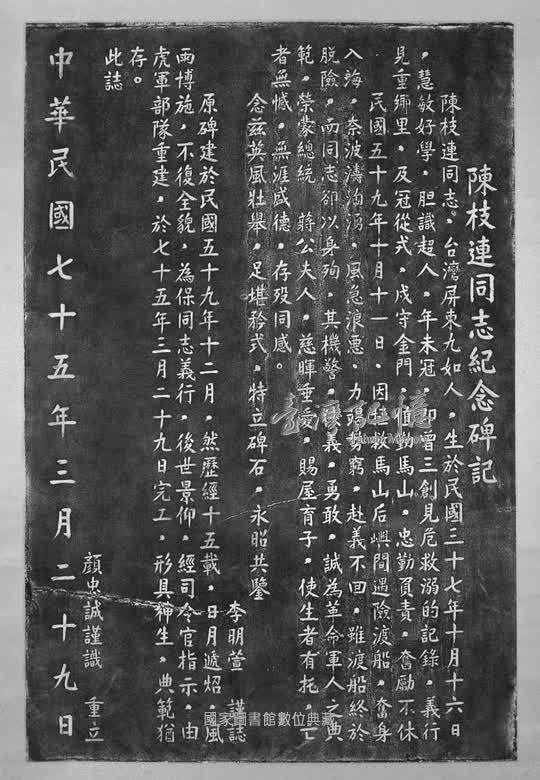 碑碣原文:陳枝連同志,台灣屏東九如人,生於民國三十七年十月十六日;慧敏好學,胆識超人。年未冠,即曾三創見危救溺的記錄,義行見重鄉里。及冦從戎,戍守金門、值勤馬山,忠勸負責,奮勵不休。 民國五十九年十月十一日,因拯救馬山后嶼間遇險渡船,奮身入海;奈波濤洶湧,風急浪惡,力竭勢窮,赴義不回。雖渡船終於脫險,而同志卻以身殉;其機警、俠義、勇敢,誠為革命軍人之典範。榮蒙總統蔣公夫人慈暉垂愛,賜屋育子,使生者有托、亡者無憾。無涯盛德,存歿同感。 念茲英風壯舉,足堪矜式;特立碑石,永昭共鑒。 李明萱謹誌。 原碑建於民國五十九年十二月,然歷經十五載,日月遞炤、風雨博施,不復全貌。為保同志義行,後世景仰;經司令官指示,由虎軍部隊重建,於七十五年三月二十九日完工,形具神生,典範猶存。此誌。 顏忠誠謹識重立。 中華民國七十五年三月二十九日。