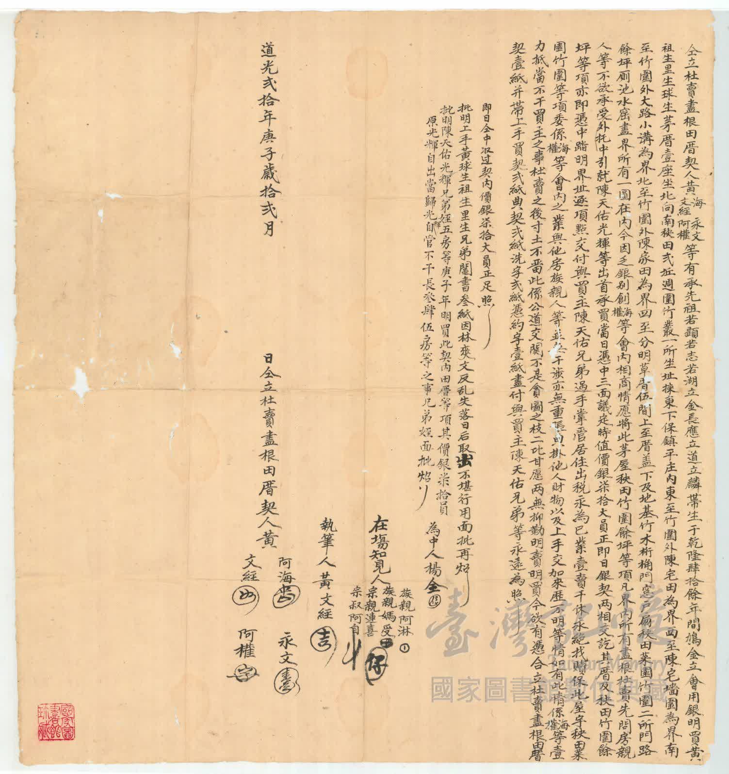 立契人、承受人、關係人:。 黃海、黃文經、黃永文、黃阿權、陳天佑、陳光輝、為中人楊金,在場知見人族親黃阿淋、族親黃媽受、宗親黃連喜、宗叔黃阿自,執筆人黃文經 。黃若顯、黃若治、黃若湖、黃立金、黃長應、黃立道、黃立麟、黃帶生,黃祖生、黃理生、黃球生。
