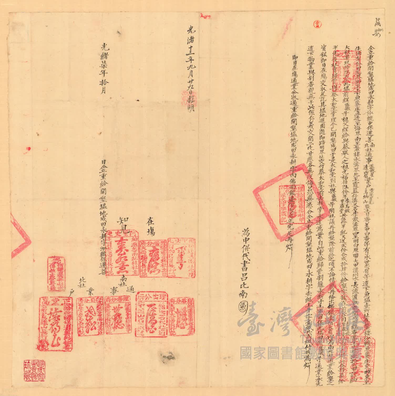 立契人、承受人、關係人:。 添敏星、遠山眉,豐年星毛、烏蚋山,甲白番、蔡太和堂、為中併代書呂比南,在場大雨麟仁、日加巳甘,知見世忠眉,。