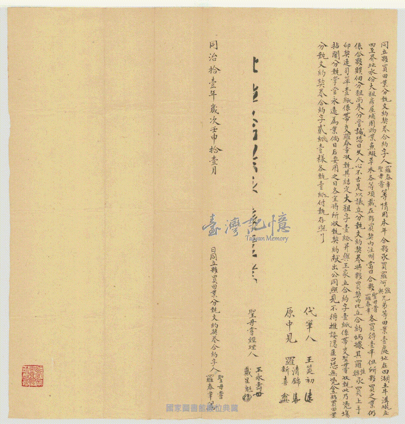立契人、承受人、關係人:。 羅春章、聖母嘗、代筆人王筵初,原中見羅清錦、羅欣喜,聖母嘗經理人王永壽、戴星魁。上手羅阿強、羅阿興。