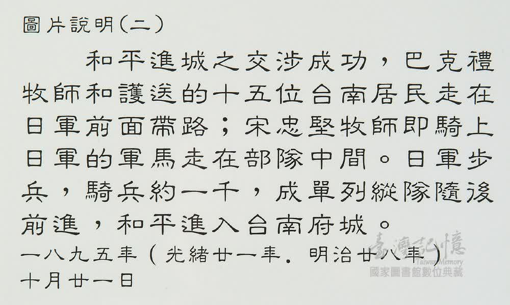 1895年(光緒十一年),清朝在甲午戰爭失敗後,將臺灣割讓日本。日軍分南北兩路前來接收臺灣。臺灣民主國曇花一現,官員逃逸,南部的劉永福將軍所率領的黑旗軍也退離臺灣,劉永福本身由安平潛逃中國,留下驚慌失措的百姓。臺南市的紳商請求英國人巴克禮牧師與宋忠堅牧師為他們出面,與日本軍方和談。十月20日臺南市民代表十七人,以及兩位基督徒,與巴克禮牧師、宋忠堅牧師一同前往二層行,成功地達成日軍和平進城的協議。十月21日早晨,在巴克禮牧師前導,宋忠堅牧師在日本騎兵之間行進,一起和平地進入臺南城。