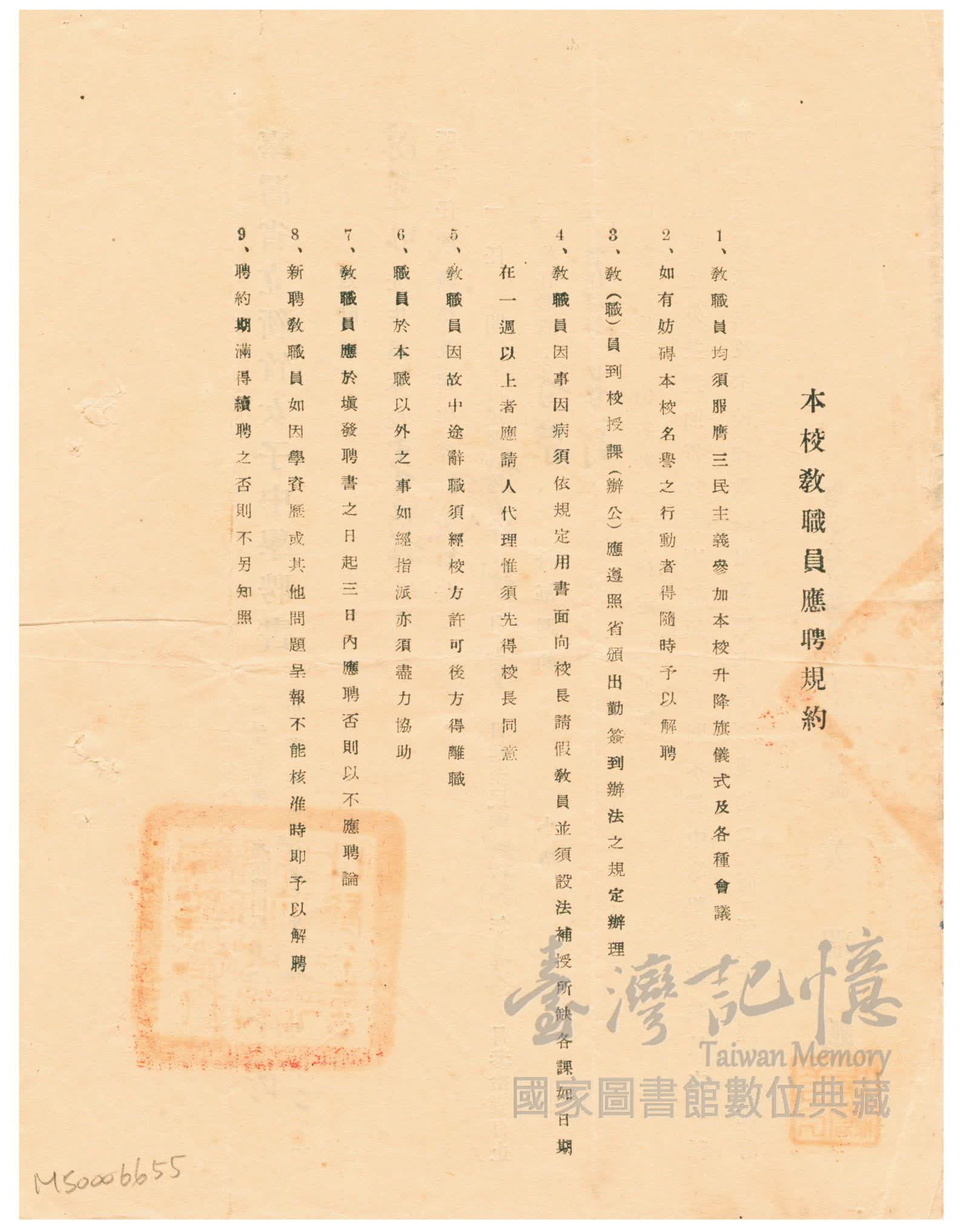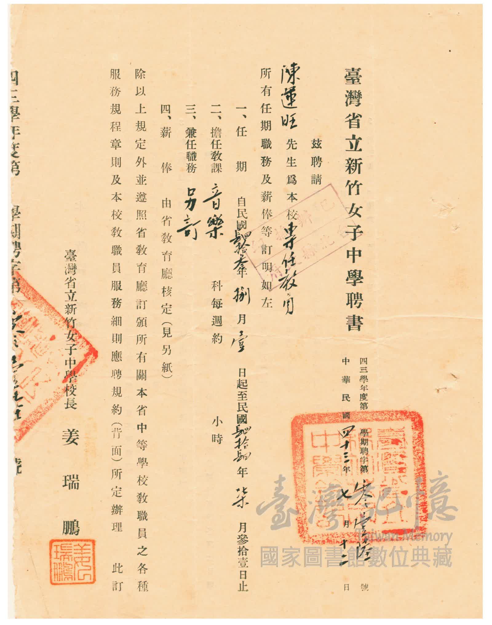 臺灣省立新竹女子中學聘書