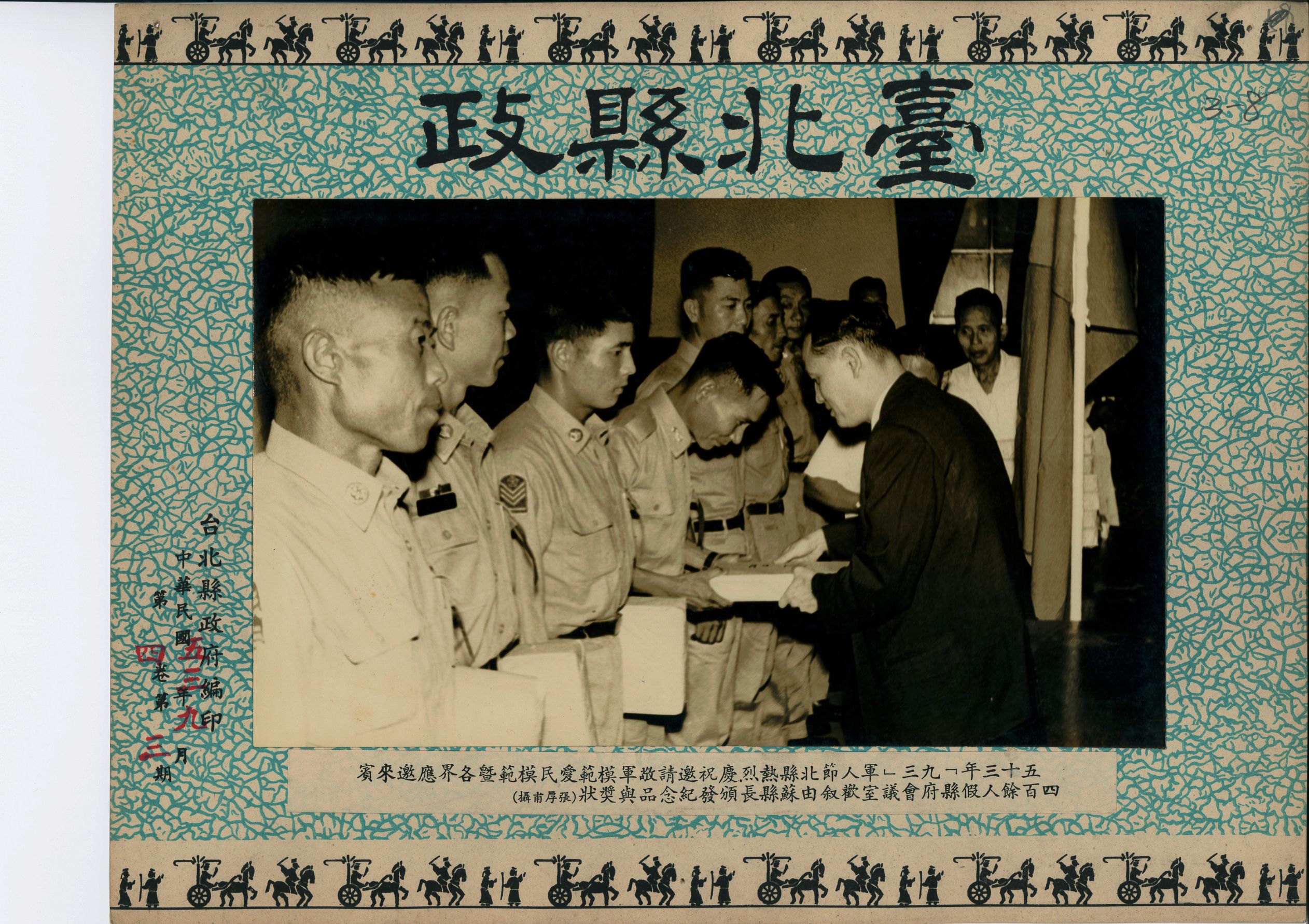 1964(民國53)年9月臺北縣熱烈慶祝「九三」軍人節,邀請敬軍模範、愛民模範以及各界應邀來賓四百餘人,於縣政府會議室歡敘。照片中共7人待領獎,皆身穿卡其色軍服,身姿挺拔,臺北縣長蘇清波身著西裝正在頒發第4個獲獎代表紀念品與獎狀,獲獎代表鞠躬感謝縣長,位於縣長右邊為協助遞紀念品與獎狀的工作人員。