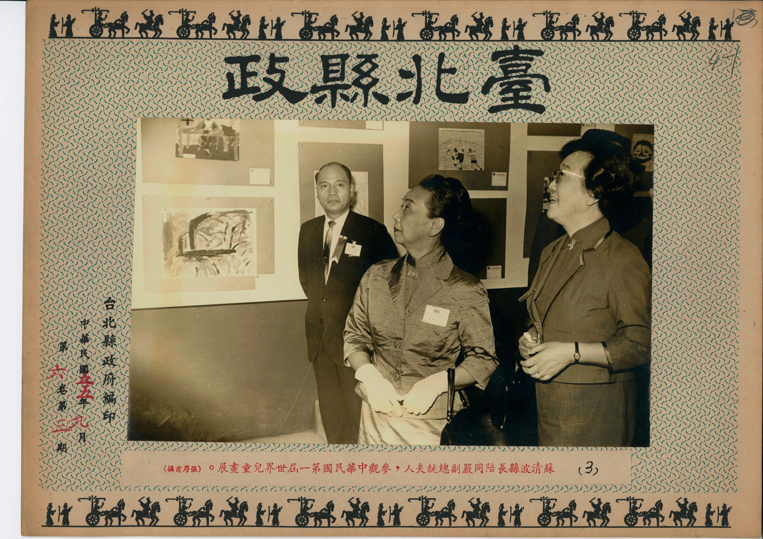 1966(民國55)年9月,臺北縣長蘇清波陪同嚴副總統家淦夫人劉期純女士,前往新莊國民學校參觀中華民國第一屆世界兒童畫展。照片中嚴副總統夫人著正式套裝,左胸口配戴貴賓名牌,雙手戴白手套,正在欣賞畫作,身後有一位女士陪同,縣長蘇清波陪在兩位女士旁。
