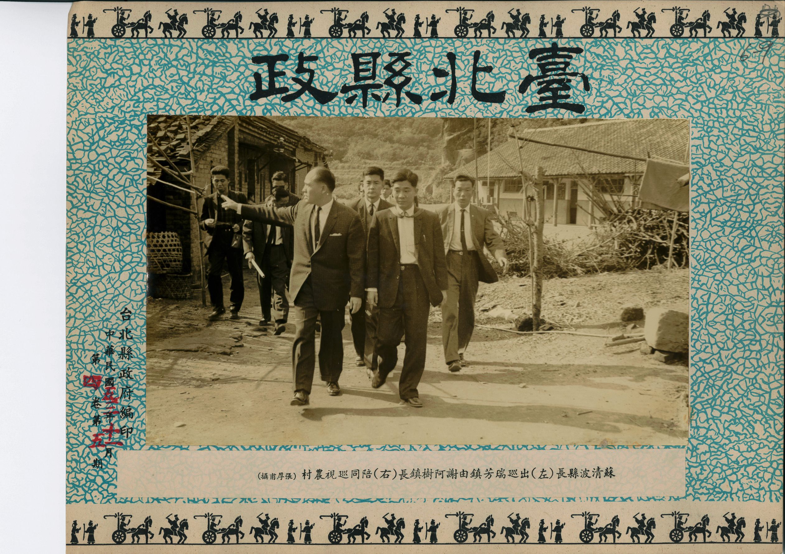 1964(民國53)年11月,臺北縣長蘇清波巡視瑞芳鎮,由謝阿樹鎮長(右)陪同巡視當地農村,兩人後面有數位工作人員,一行約10人,看起來風塵僕僕。照片背景為鬱鬱蔥蔥的山林,兩旁為住家,右方還有就地利用的樹木及竹子搭建起的簡陋曬衣架,上面曬著布。