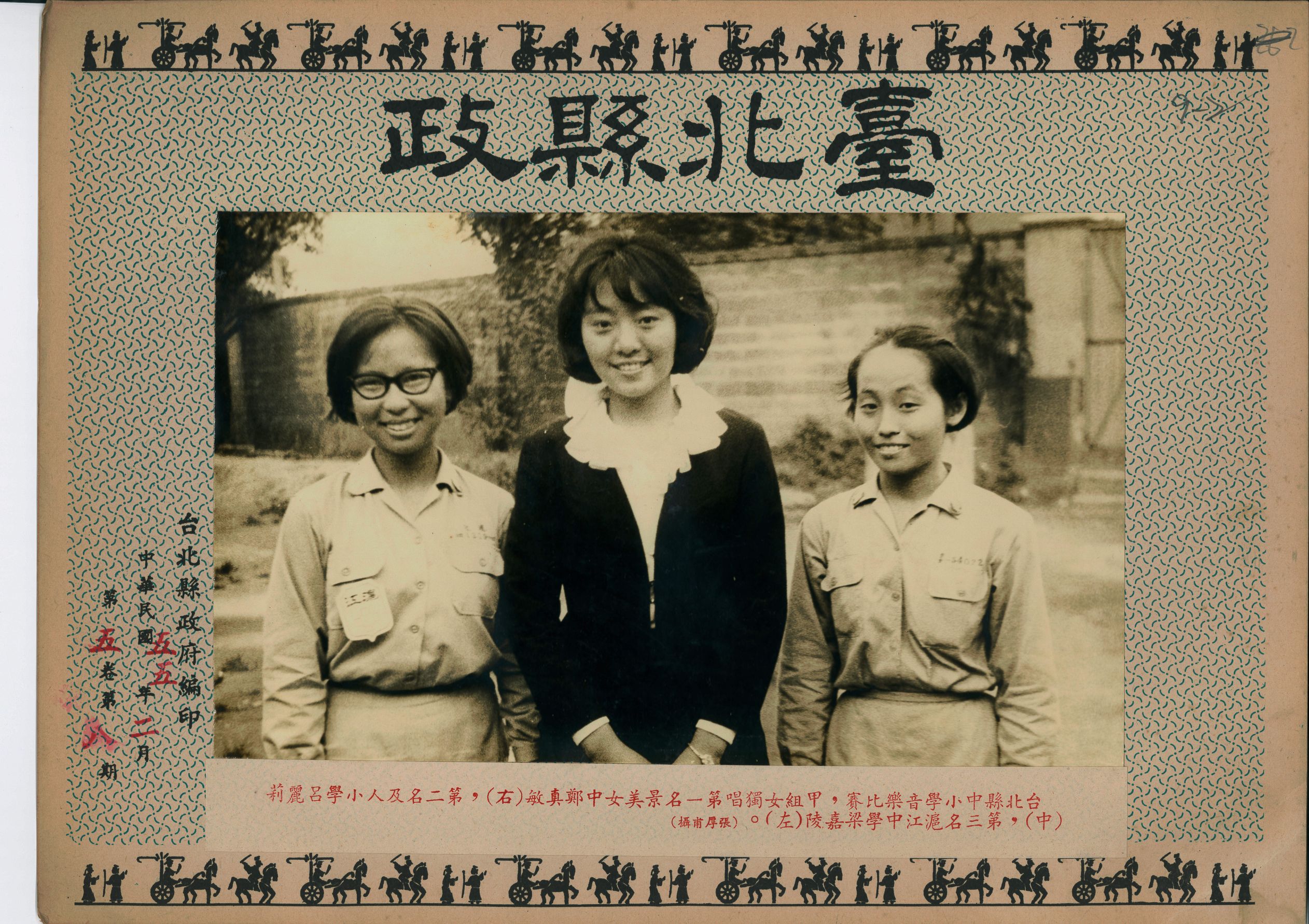 1966(民國55)年2月臺北縣中小學音樂比賽的得獎者,右起為甲組女獨唱第一名景美女中鄭真敏同學,中間為第二名及人小學呂麗莉同學,左為第三名滬江中學梁嘉陵同學。第二名呂麗莉,後至義大利米蘭威爾第音樂學院主修聲樂,成為台灣頗富盛名的聲樂家、歌劇家。