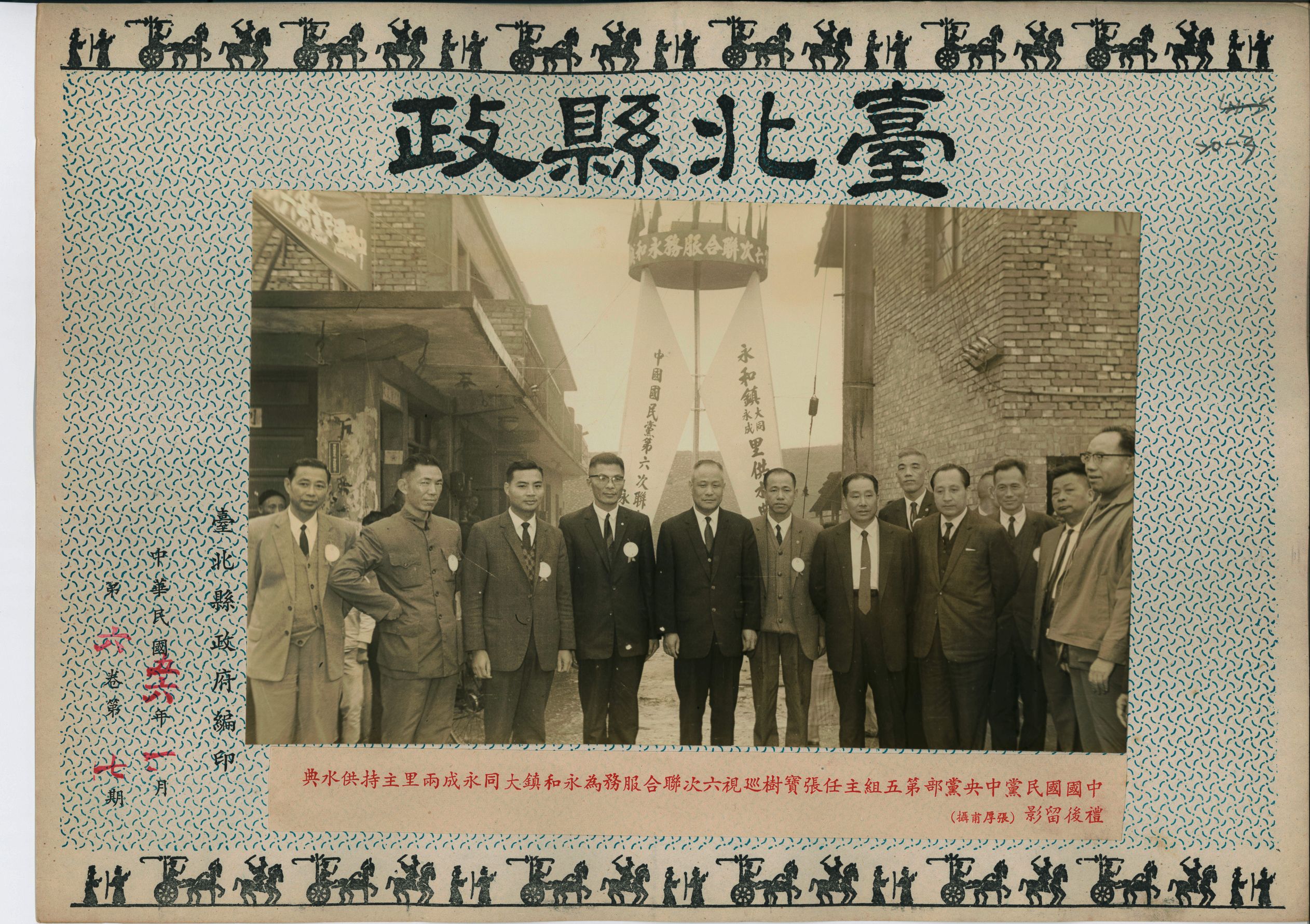 1967(民國56)年1月,中國國民黨中央黨部第五組主任張寶樹,巡視第六次聯合服務為永和鎮大同、永成兩里主持供水典禮後留影。照片中12人皆為男性,清一色著西裝,面帶微笑。