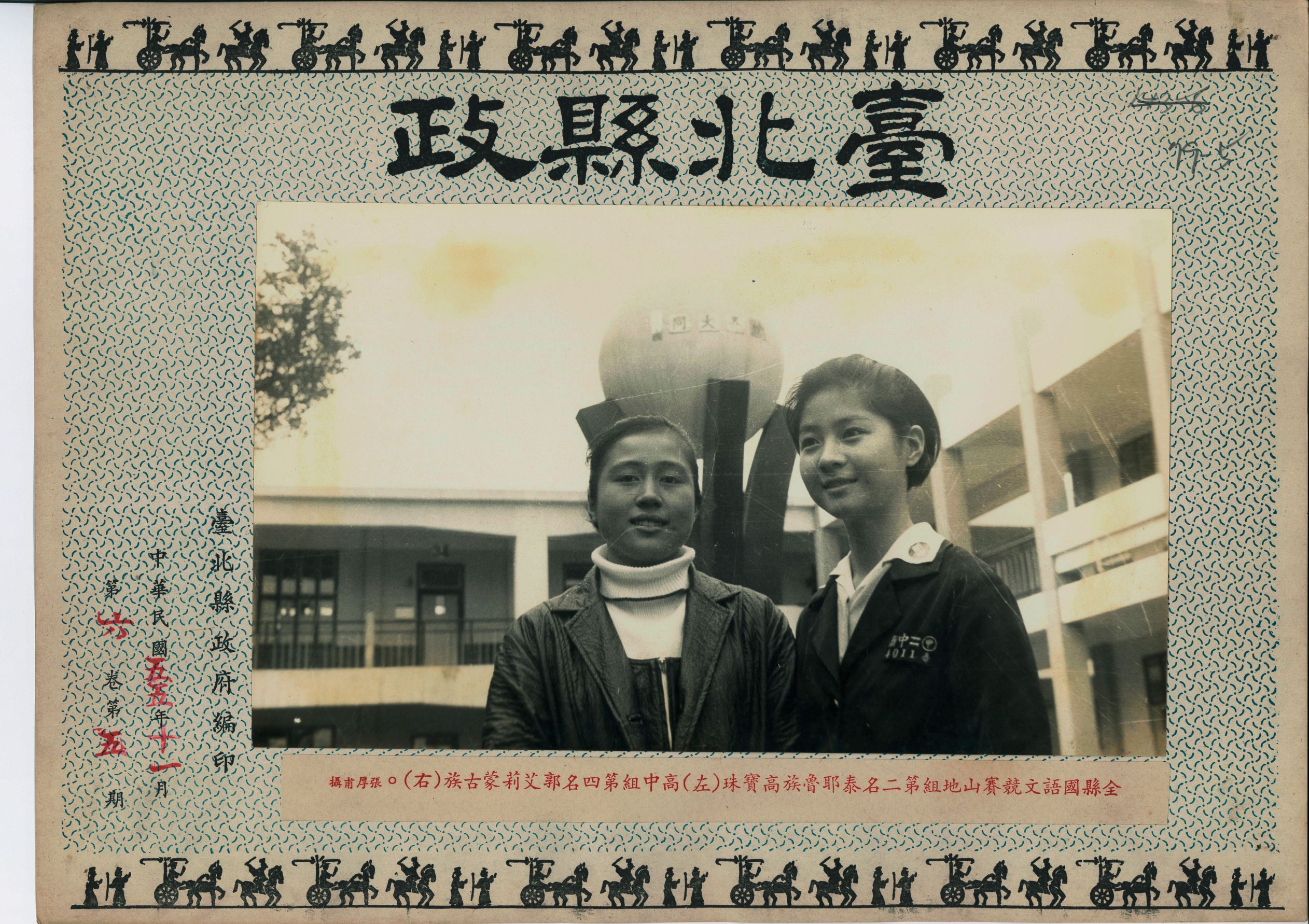 1966(民國55)年11月,臺北縣舉行國語文競賽,照片中的參賽代表為當年表現優異的學生,左為山地組第二名泰耶魯族高寶珠、右為高中組第四名蒙古族郭艾莉,而泰耶魯族,就是現在所稱的泰雅族。
