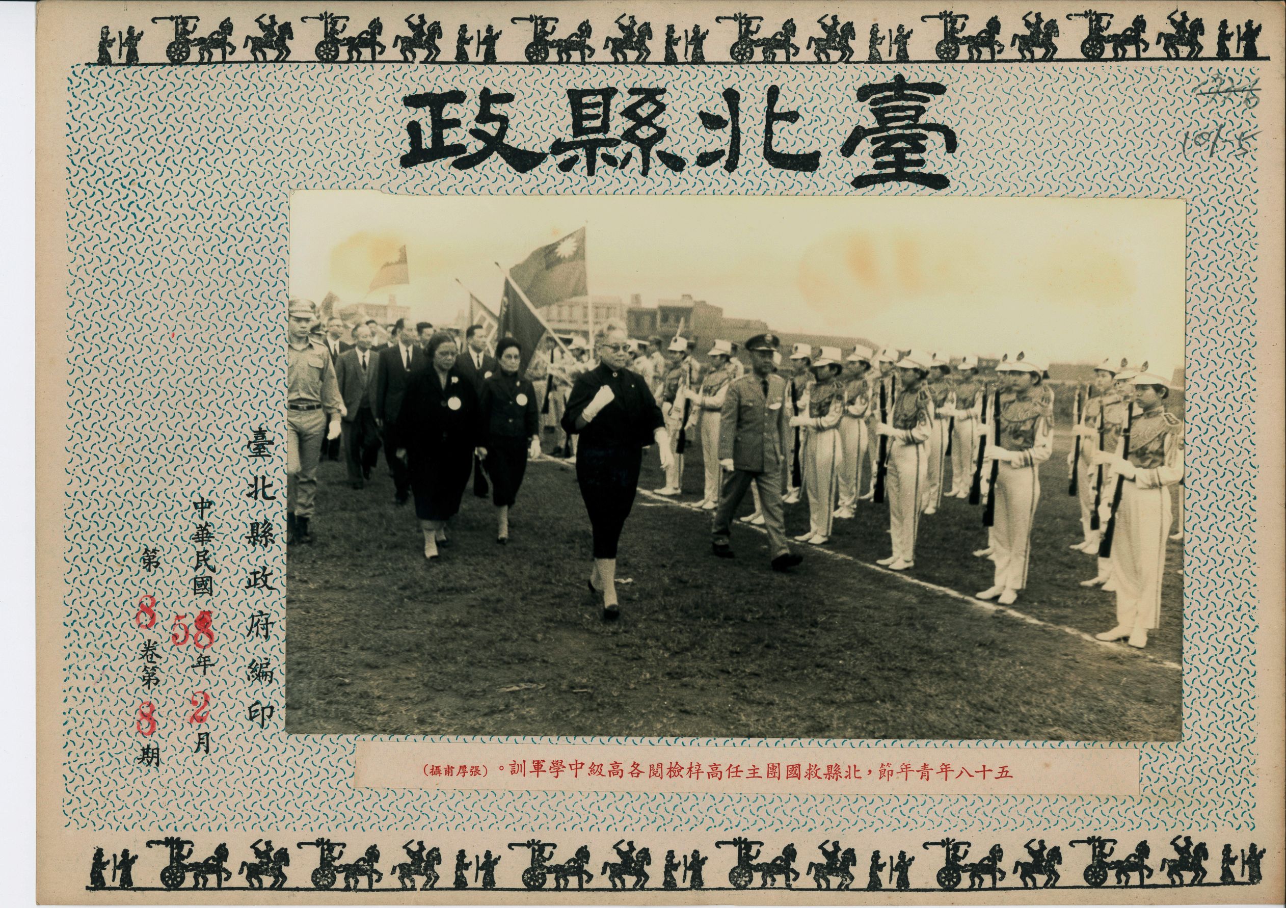1969(民國58)年青年節,臺北縣救國團主任高梓等一行人檢閱各高級中學軍訓。照片中的高中生穿著像是儀隊的服裝,手持禮槍,整齊劃一的站在操場上接受檢閱。