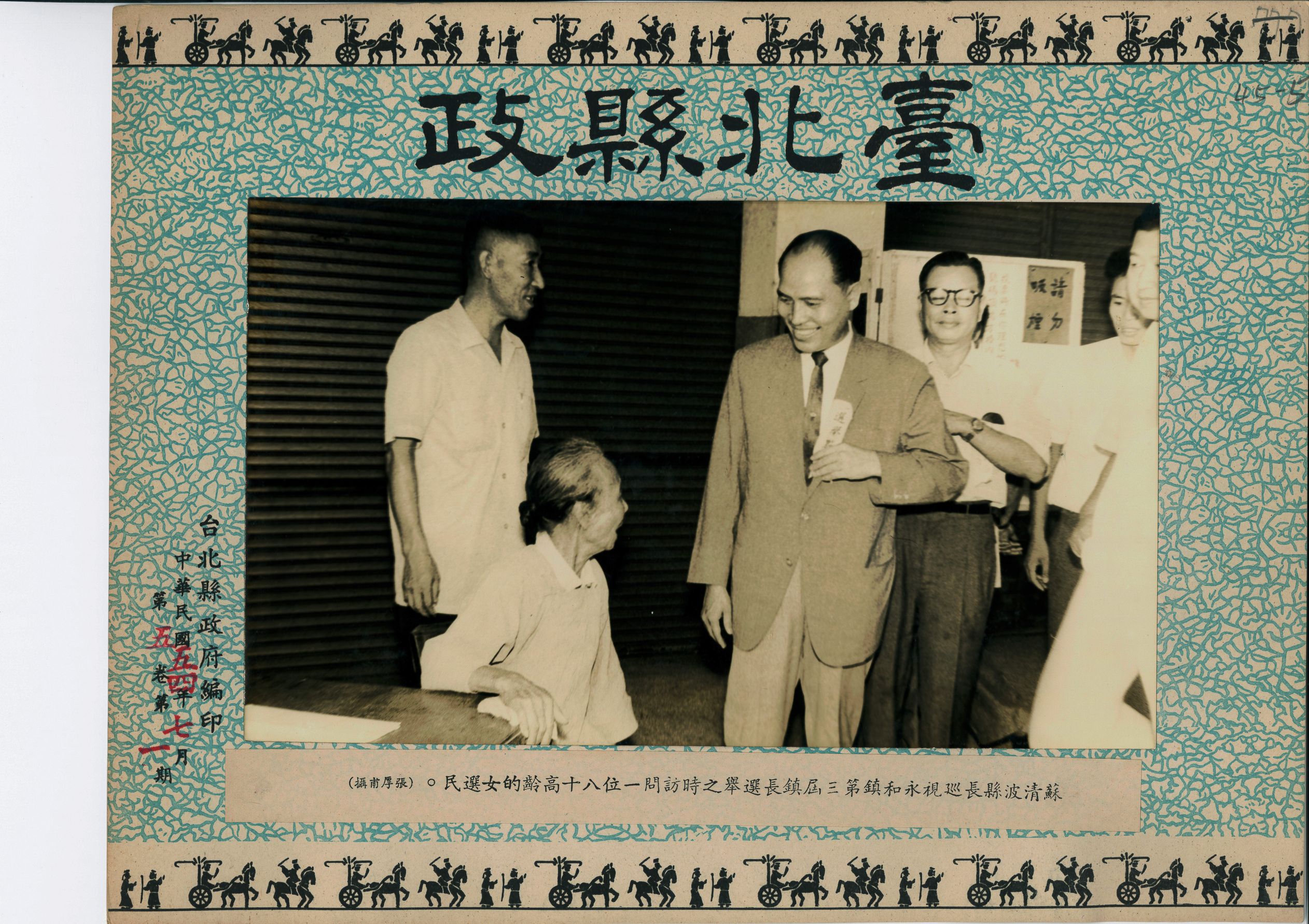 1965(民國54)年7月25日,臺北縣長蘇清波巡視永和鎮第三屆鎮長選舉時,與當地一位八十高齡的女性長者閒話家常。女選民因年事已高,頭髮有些稀疏,仍梳著當時婦女流行的髮髻,很高興的很蘇縣長聊天。從照片看到投票場所標示著請勿吸煙,這項禁止吸菸的規定也延續至現今的選舉。